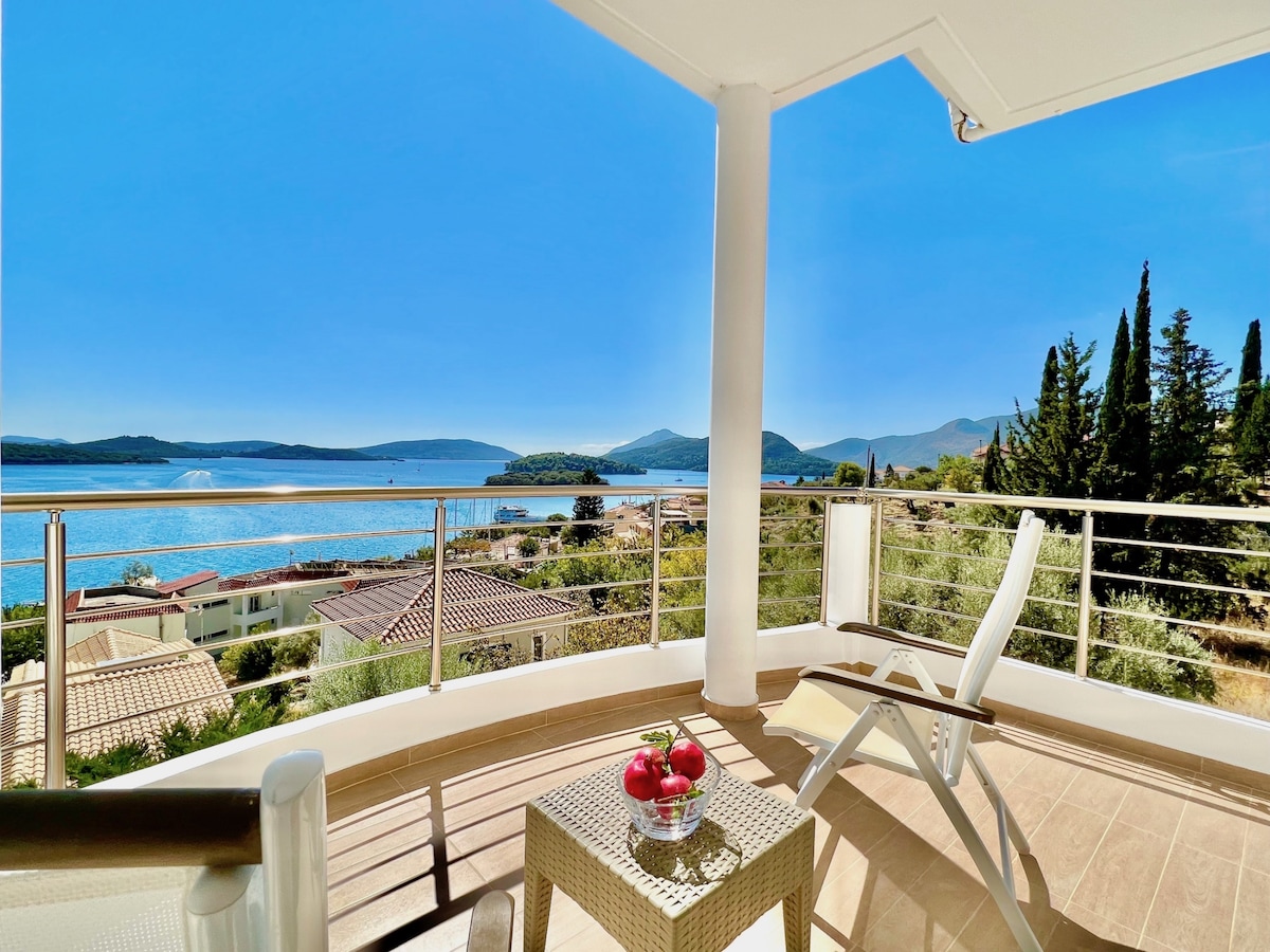 Este lugar especial se encuentra en el centro de Nydri, el centro vacacional de verano más grande de Lefkada, lo que lo convierte en la base ideal para explorar la isla. ¡Estos apartamentos totalmente equipados tienen una ubicación ideal y te ofrecen la comodidad del centro de Nydri, pero también la paz y la tranquilidad con una vista increíble! El amplio balcón es ideal para relajarse mientras disfrutas de las vistas. Toma un libro o tu bebida favorita y disfruta de la ligera brisa y el cielo nocturno.