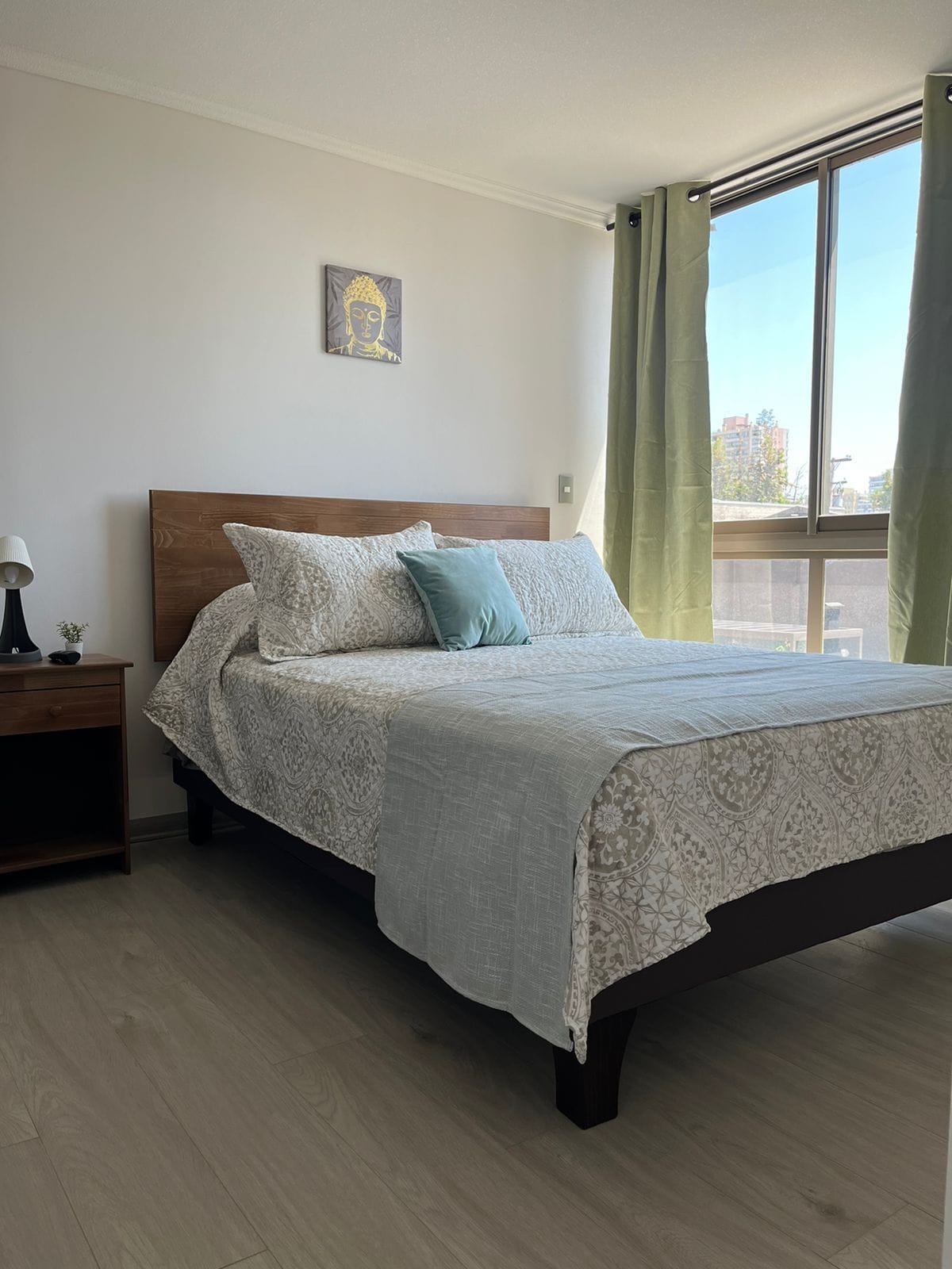 Acogedor y luminoso departamento con balcón, equipado con cama queen y un futón para un tercer huésped. Cocina Full Equipada Wi‑Fi 500 Mbps Smart TV Guarda‑equipaje gratis Pet‑friendly A solo 3 min del Metro Departamental, supermercados, restaurantes y cafés a pasos. Autopista Central a solo 5 min. Disfruta de gimnasio, quinchos y lavandería autoservicio en un edificio residencial seguro con conserjería 24/7. Ideal para parejas y estadías largas. ¡Reserva y vive Santiago como en casa!