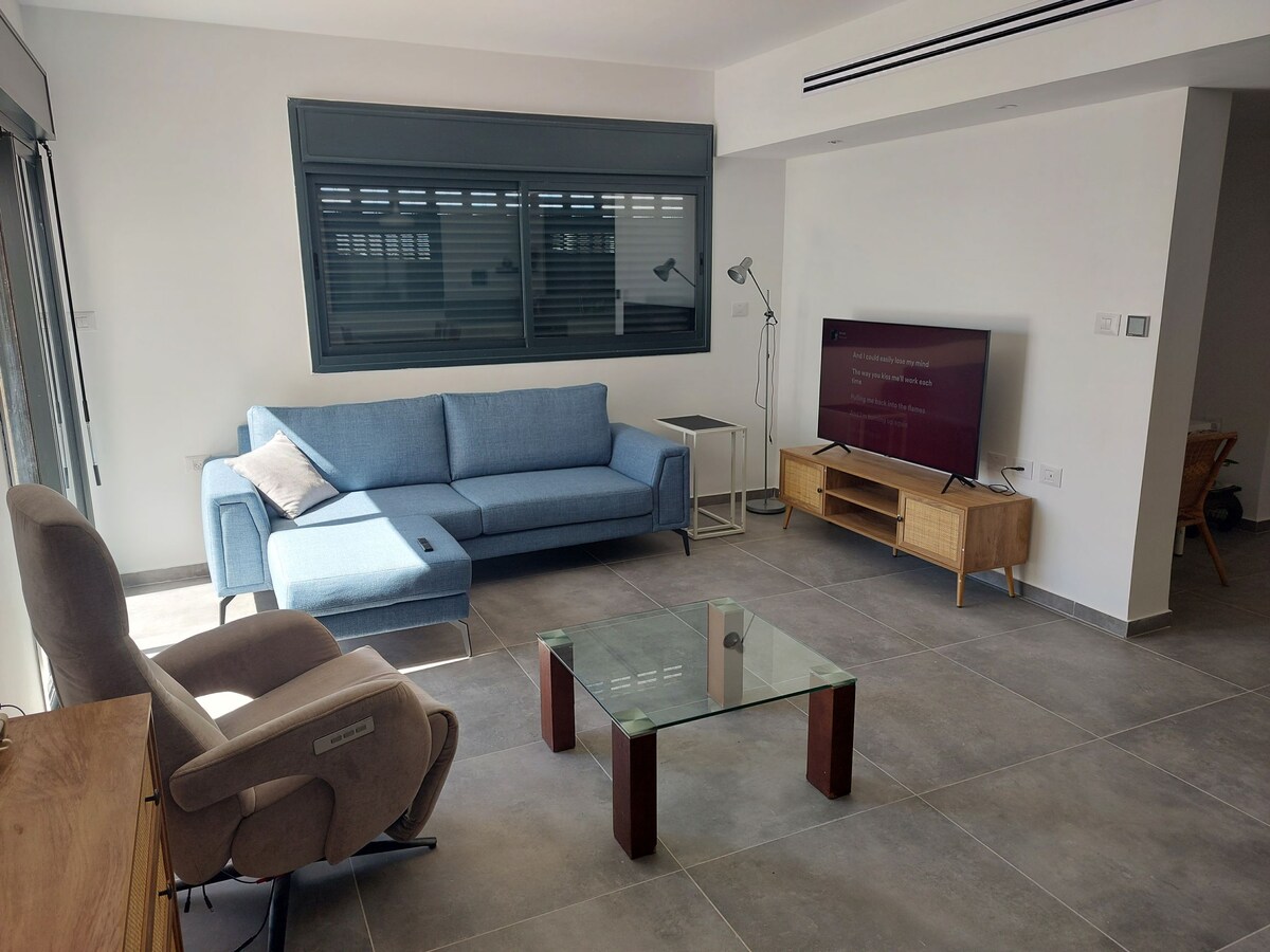 Relájate en esta escapada única y tranquila. Una villa espaciosa con 3 dormitorios, una acogedora sala de estar, un espacio de trabajo y una cocina totalmente equipada hasta el más mínimo detalle. Fuera de la villa hay un gran patio con una fogata y una barbacoa, una piscina de remo refrescante, un parque infantil y áreas de estar. Una escalera fácil te llevará a una azotea con una espectacular vista de 360 grados donde puedes practicar yoga o simplemente gatear y ver las estrellas. Máximo 7 huéspedes. Una villa tranquila para los amantes de la tranquilidad del desierto. La villa está en la comunidad de Tzukim (a 1 minuto a pie de la vista de Tzukim) y todos los espacios públicos de Nof Zuqim también están disponibles para los huéspedes de la villa.
