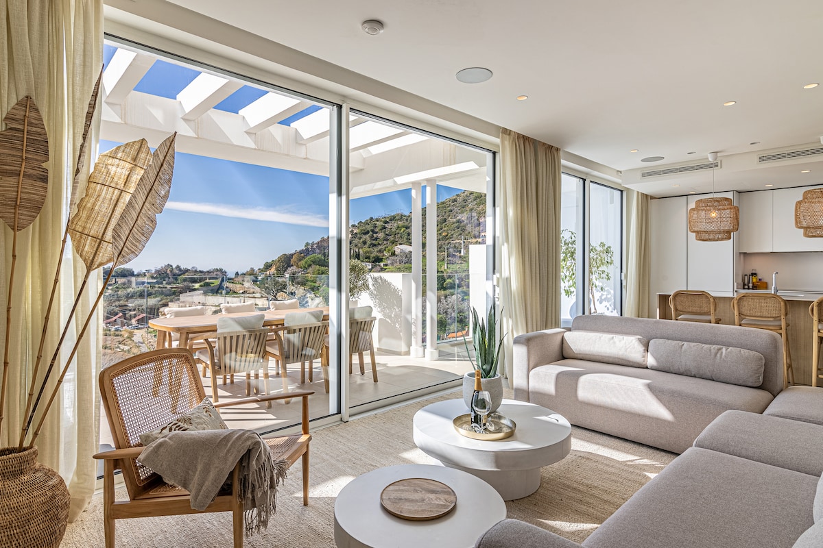 Wake up to breathtaking panoramic sea views in this stylish 3-bedroom, 3-bathroom luxury retreat in Las Lagunas de Mijas. Just steps from the beach, this modern sanctuary offers an expansive terrace, a sleek open-concept living space, and resort-style amenities for the ultimate Costa del Sol getaway. ✔ Spectacular ocean & mountain views from the living area & bedrooms ✔ Resort-style pool, sauna & free gym ✔ Fully equipped kitchen & spacious dining area ✔ Private terrace ✔ Fast Wi-Fi & SmartTV