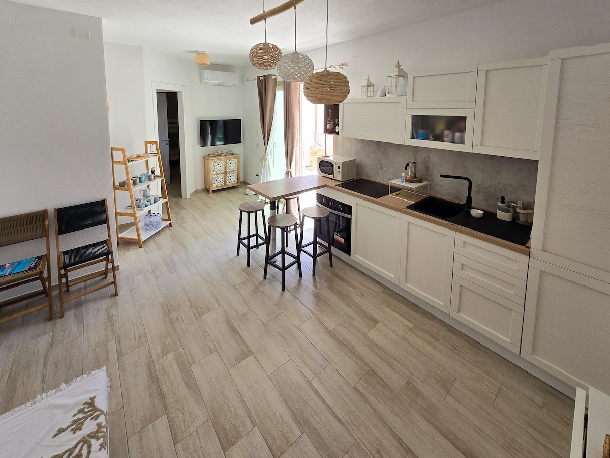 En una zona tranquila, en la primera colina de Budoni y cómodo para todas las playas, en un elegante entorno con decoraciones de piedra sarda y madera, tres habitaciones independientes, en el primer piso, recientemente reformado, que consta de: pequeño patio de acceso con ducha exterior, terraza de servicio, amplio salón con cocina americana bien equipada, amplia terraza cubierta con vistas al mar, 2 habitaciones dobles (una de las cuales se puede convertir en doble), baño con ducha.