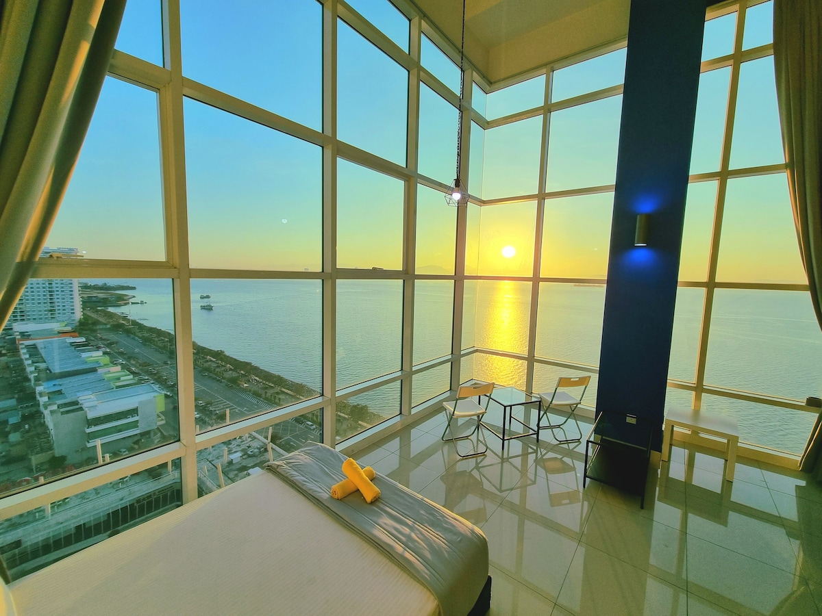 • VISTA PANORÁMICA AL MAR DE 180° • Desbloquea 180° VISTA AL MAR • Vista AL AMANECER • Vista de Penang Bridege • En la orilla del mar • 1200 pies cuadrados - Estacionamiento privado. • WiFi de 100 Mbps • >30 restaurantes, cafeterías, pubs, Starbucks, Coffee Bean, Subway, 7-Eleven están en el nivel 2 de nuestra casa • Totalmente climatizado • A menos de 3 km o 5 a 10 minutos en auto de Chew Jetty y el casco antiguo declarado Patrimonio de la UNESCO.