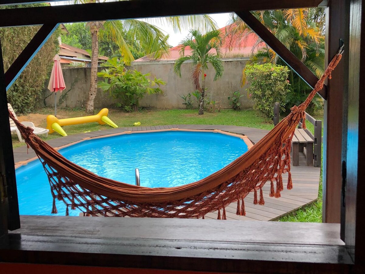 A solo 4 minutos andando del Maroni y del centro de Saint Laurent, venga a relajarse bajo un carbet amerindio. Podrá colgar su hamaca y disfrutar de un café de calidad con mucho gusto. Dentro de la casa totalmente climatizada, tiene todo lo necesario para preparar una buena comida. Para la noche, relájese viendo su serie favorita en Netflix. Una ropa de cama de calidad le dará la bienvenida para una noche de dulzura.