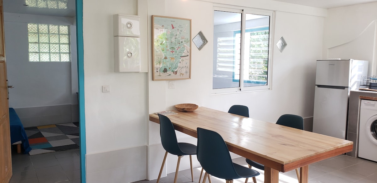 Acogedor estudio independiente, equipado, ideal para sus viajes. A 5 minutos del centro de la ciudad en auto, cerca de las tiendas de primera necesidad Mimie y Fredo le aseguran una cálida bienvenida - Posibilidad de acceso a una lavadora de forma gratuita - Aire acondicionado + ventilador de pared - Terraza de madera de Guy - Smart TV Netflix, Prime Video y My canal incluidos - piscina privada de uso exclusivo - cocina exterior + bbq (carbón incluido) - -de 15 años no autorizados - estacionamiento privado - 2 hamacas en la terraza
