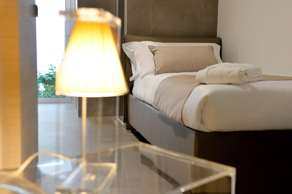 Ampia e confortevole stanza con colazione in camera nata dall'esperienza dei nostri viaggi è stata progettata per essere il più possibile comoda e funzionale, di fatti è composta da: spazio esterno con veranda, camera da letto con spazio di lavoro dedicato e un angolo adibito al consumo di eventuali pasti d'asporto e Tv42" con Netflix incluso, corridoio con armadio e 2 poggia valigie, ampio bagno completo con doppio lavabo e doccia. Dalla veranda, dove è presente un accogliente salottino adatto anche per fumare, si accede alla camera da letto. La camera può essere allestita con un letto matrimoniale o con due letti singoli, a seconda delle preferenze degli ospiti. Troverete una TV con Netflix incluso, connessione Wi-Fi, carica batterie wireless e presa USB-C. Inoltre, è a disposizione il frigo bar e un bollitore per preparare tè e infusi. La macchina del caffè è in grado di fare anche cappuccini. Proseguendo lungo il corridoio, gli ospiti troveranno un ampio armadio e 2 comodi poggia valigie. Infine, il bagno completo con doccia e doppio lavabo, oltre a un kit di cortesia e asciugamani inclusi. Il phon è a disposizione per gli ospiti. La colazione verrà servita in camera al mattino, in base all’ordine depositato la sera precedente.