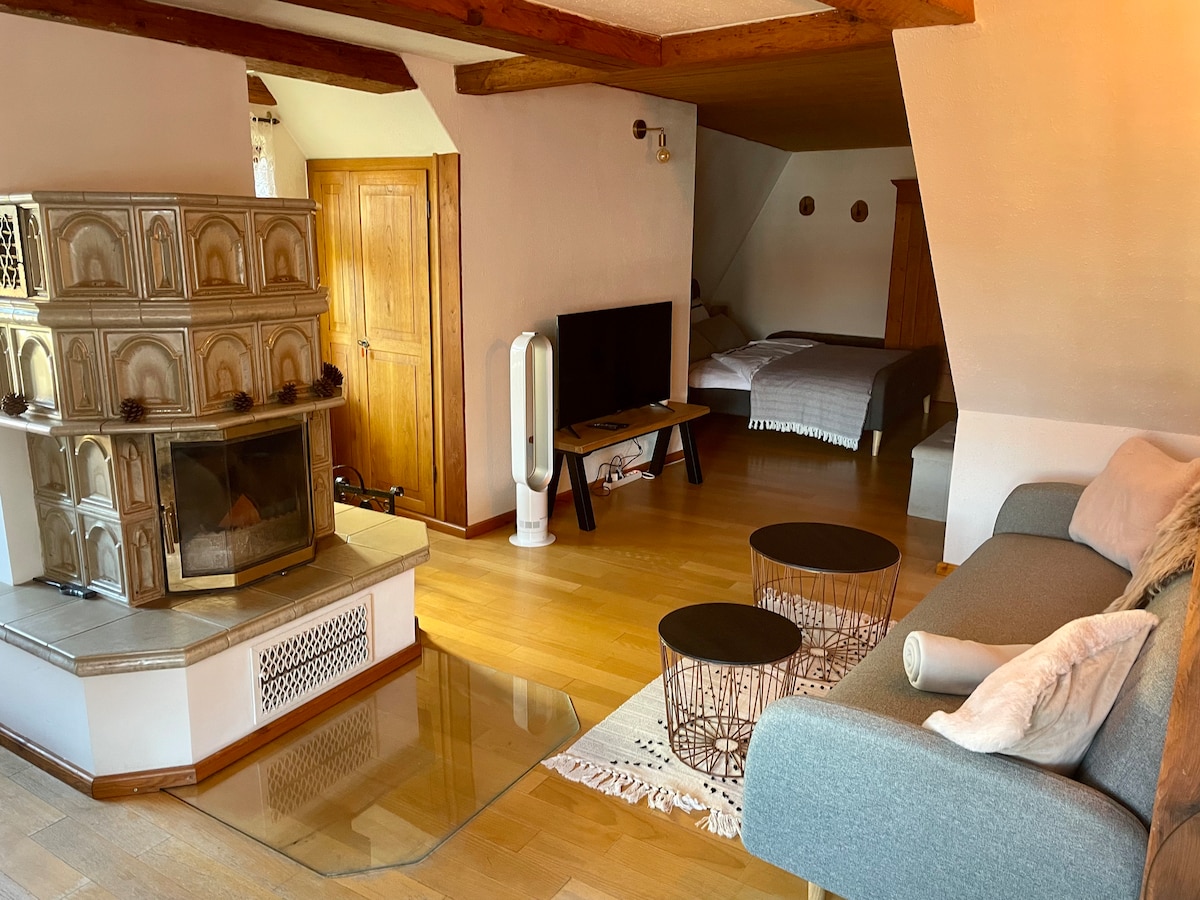 Este hermoso apartamento con su carácter de loft permite una vista de casi 360 grados sobre los tejados de Schlossberg. En el centro de la sala de estar hay una hermosa chimenea con un rincón de lectura al lado y un cómodo sofá con vistas al fuego parpadeante de la chimenea. En la entrada, junto al baño con luz natural y ducha, hay una pequeña cocina americana con zona de comedor para desayunar por la mañana, con vistas al casco antiguo de Quedlinburg.