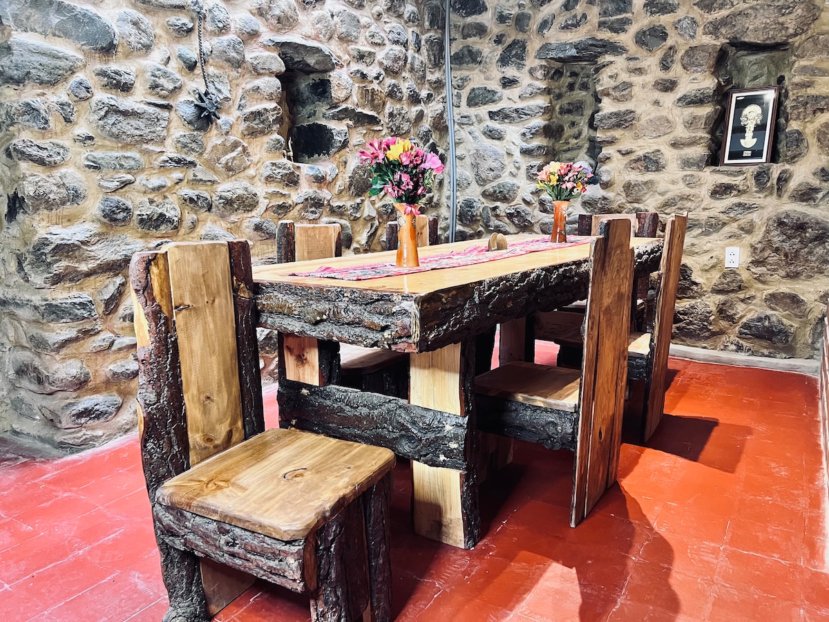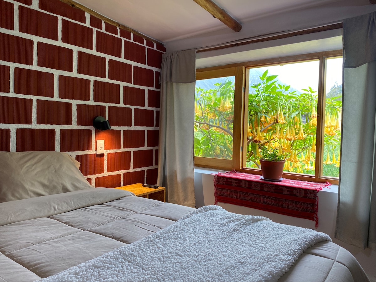 Forget your worries in this spacious and serene space. Connect with nature and enjoy the Inca’s town views. The place features a spacious and comfortable bed, a wardrobe, and nightstands. There are also cozy furnishings for relaxation, a small equipped kitchen, and a private bathroom with plenty of hot water. The house boasts a large and beautiful garden with a fire pit area and a recreational space where you can enjoy the beauty of the mountains and Inca architecture of Ollantaytambo.