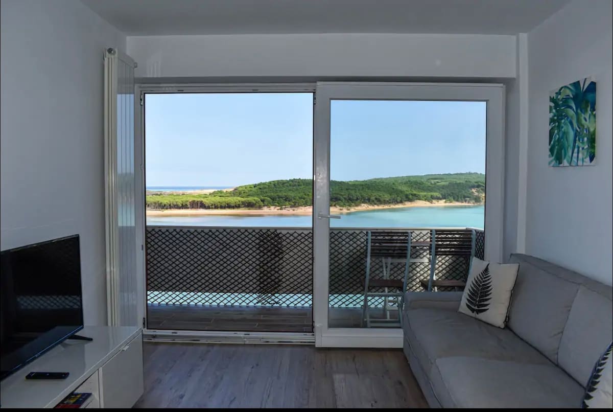 Apartamento en primer piso, con preciosas vista al Parque natural de las Dunas de Liencres y ría de Mogro. Dispone de una habitación con cama de matrimonio y salón con sofá italiano convertible en cama de 1.35m y cama supletoria de 90. Cocina completamente equipada. Se encuentra a 70m de la playa (2' caminando). A 15 minutos de Santander y Torrelavega. Fácil aparcamiento gratuito.