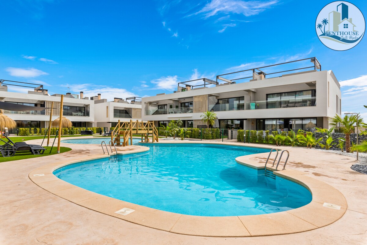 Penthouse 🏝️ de lujo | Santa Rosalía – Costa Cálida 🏝️ Para 4 personas · 2 habitaciones · 2 baños 🌞 Balcón + gran terraza en la azotea con: • Cocina al aire libre, parrilla. • Juego de salón, tumbonas y ducha exterior. 🏊♀️ Vistas a la piscina, al jardín y al lago 🌴 Incluye acceso al lago artificial (La Reserva) 📶 Wifi · ❄️ Aire 🚿 acondicionado · Calefacción por suelo radiante · Estacionamiento 🅿️ privado ⚠️ Nota: complejo turístico parcialmente en construcción – posible molestia de construcción