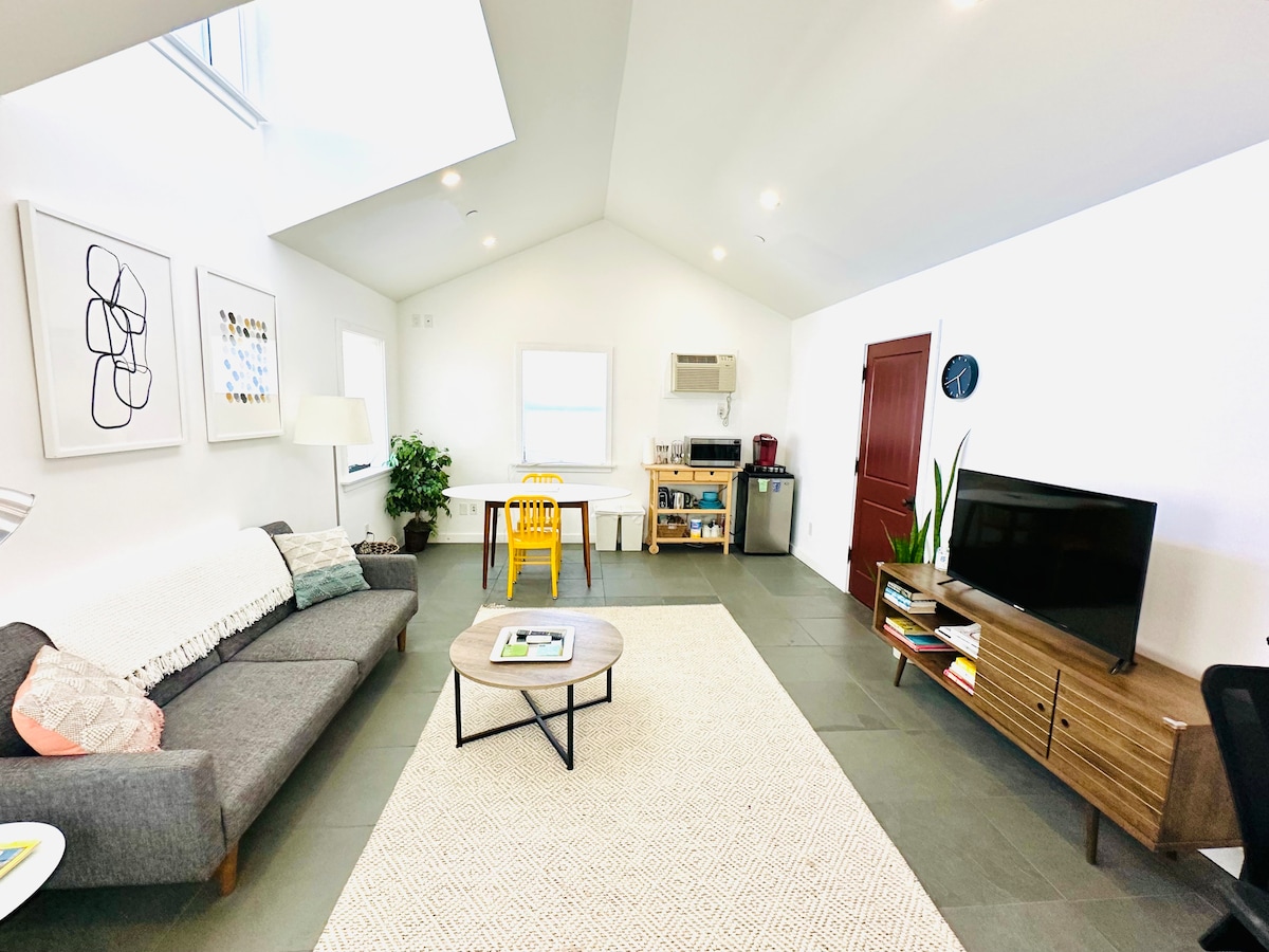 ¡Casa de huéspedes privada de un dormitorio, luminosa y espaciosa, a 3 millas de la playa, a 20 minutos de LAX, techo abovedado, calefacción, aire acondicionado y muchas comodidades! Un espacio de trabajo con monitor adicional. Un oasis privado con diseño moderno en West Culver City. Relájate en el patio entre los colibríes, transmite en la televisión inteligente o disfruta de los restaurantes locales. Respetaremos tu privacidad, pero es fácil contactarnos si es necesario. *No se permite fumar ni vapear en la propiedad.