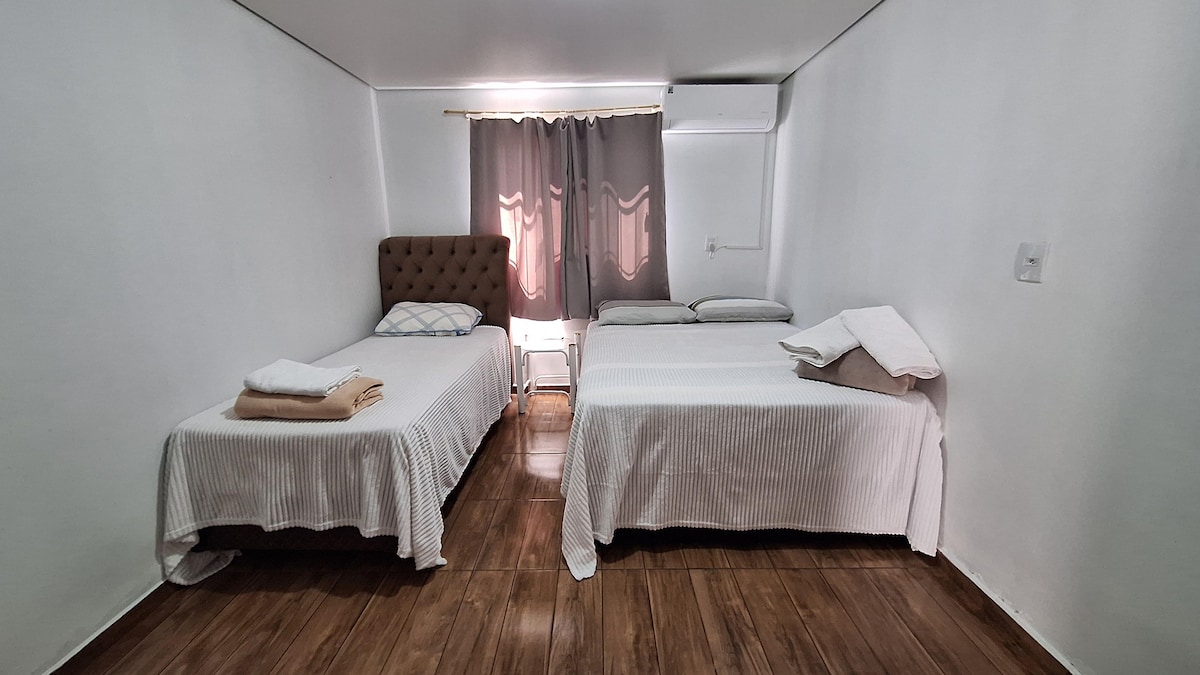 Descanse com conforto neste quarto privativo, ideal para casais ou viajantes individuais. Conta com uma cama de casal, uma cama de solteiro, ventilador e roupa de cama inclusa. Sala de estar, cozinha e banheiro são compartilhados. Localizado em bairro tranquilo e próximo ao centro de Maravilha-SC.