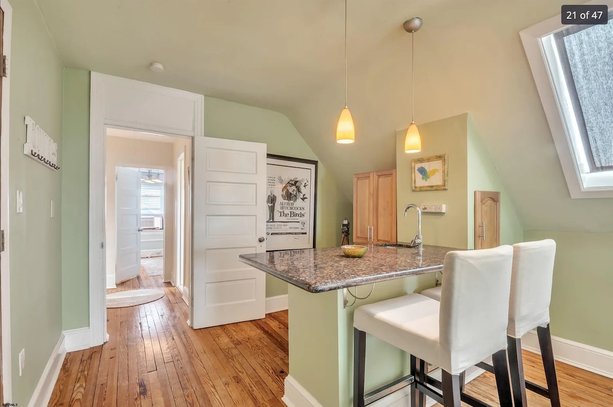 Apartamento estudio recientemente renovado, a pocos pasos del paseo marítimo de Ocean City, con vistas al mar. ¡Esta es una ubicación privilegiada a poca distancia de todo lo que la gente viene a Ocean City! ¡Nuestro espacio es compacto y pequeño pero adecuado para una escapada de 2 personas con una cama tamaño queen! El dormitorio mide 16' x 12' con un baño adjunto de tamaño completo y chimenea montada en la pared para noches acogedoras. Dos pases de playa y sillas de playa en la habitación para tu uso durante la estadía.
