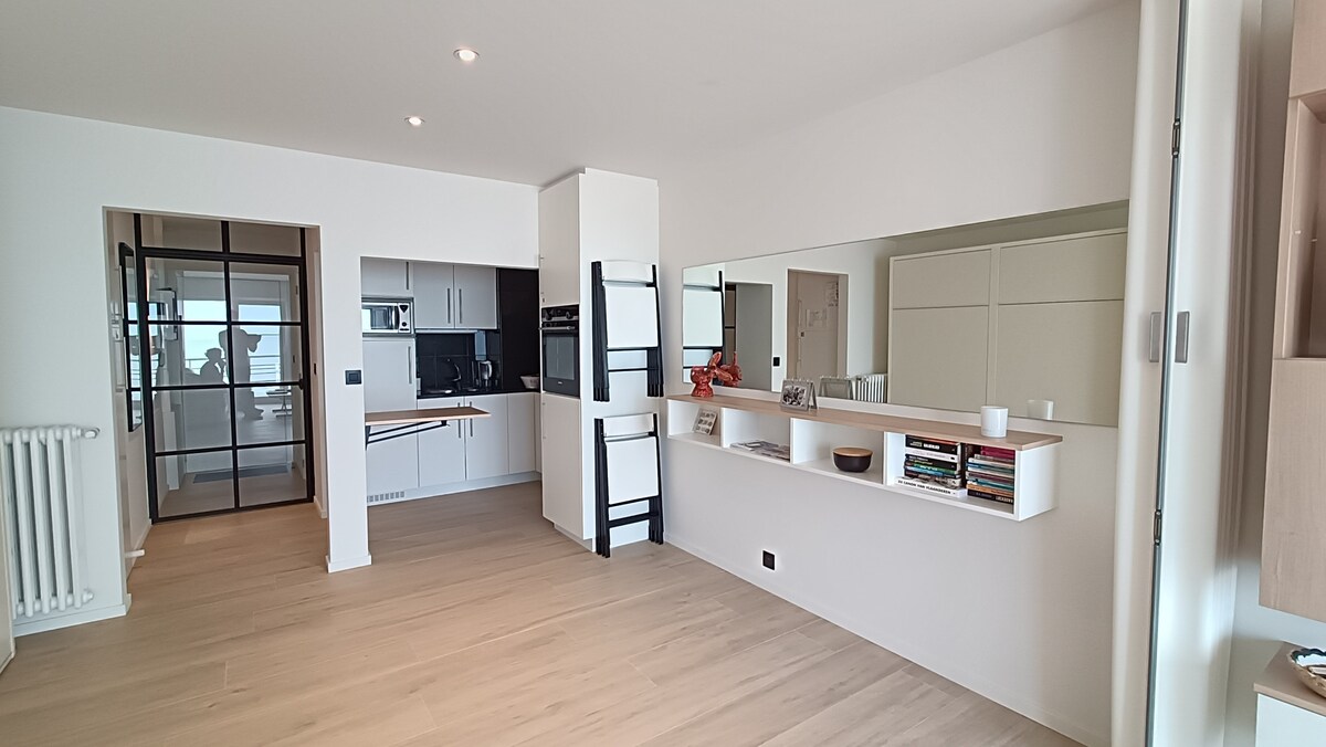 Apartamento con vistas al mar. Muy luminoso, con todas las comodidades, completamente renovado en 2023, con especial atención al acabado, la decoración y la calidad de los materiales. Todas las instalaciones son nuevas. Impresionantes vistas al mar, por supuesto, pero también amplias vistas del interior desde el dormitorio, en el séptimo y último piso del edificio. ¿El «pequeño plus»? Estos hermosos azulejos antiguos y este suelo de bambú en el que uno se siente tan bien.