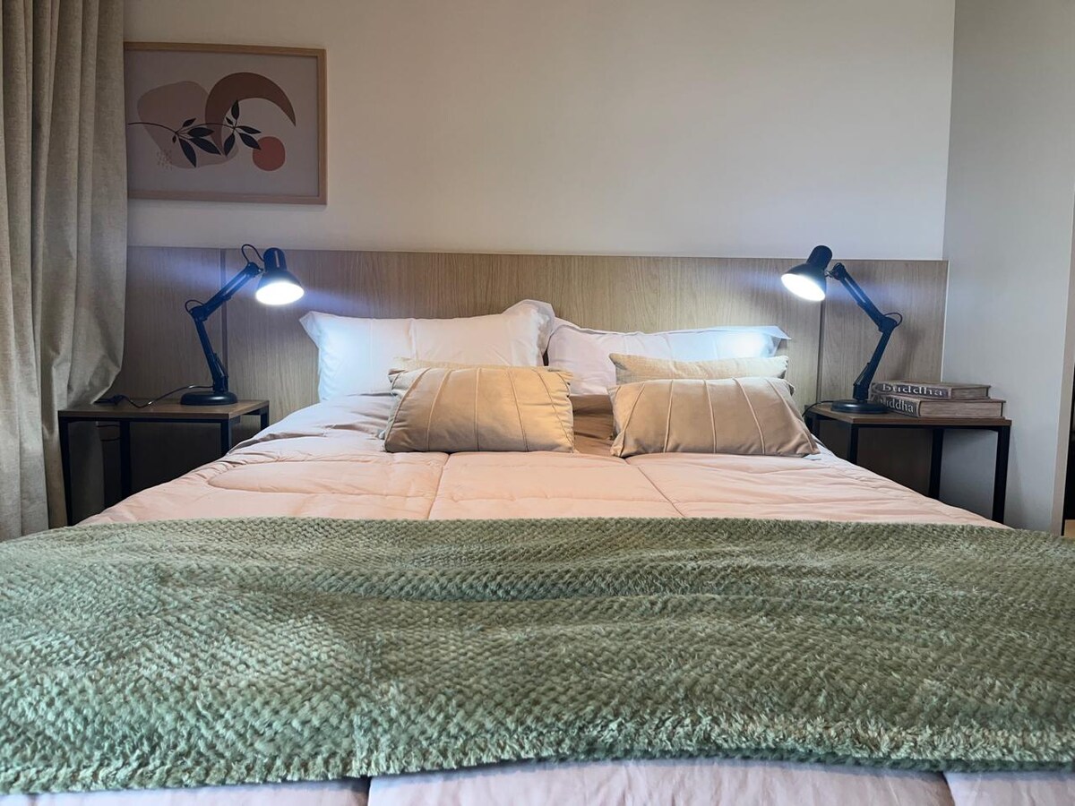 Apartamento acogedor y privado, ideal para pasar una temporada. Disfruta de la increíble ubicación de la propiedad y del fácil acceso a todo lo que necesitas en este alojamiento. Apartamento completo, con cama tamaño queen, cama y baño, televisión, aire acondicionado y wifi. El edificio tiene una sala de estudio, gimnasio, lavadero, jacuzzi y sauna. Alrededor tenemos tiendas, farmacias, supermercados, restaurantes, bares, tiendas y salón de belleza.