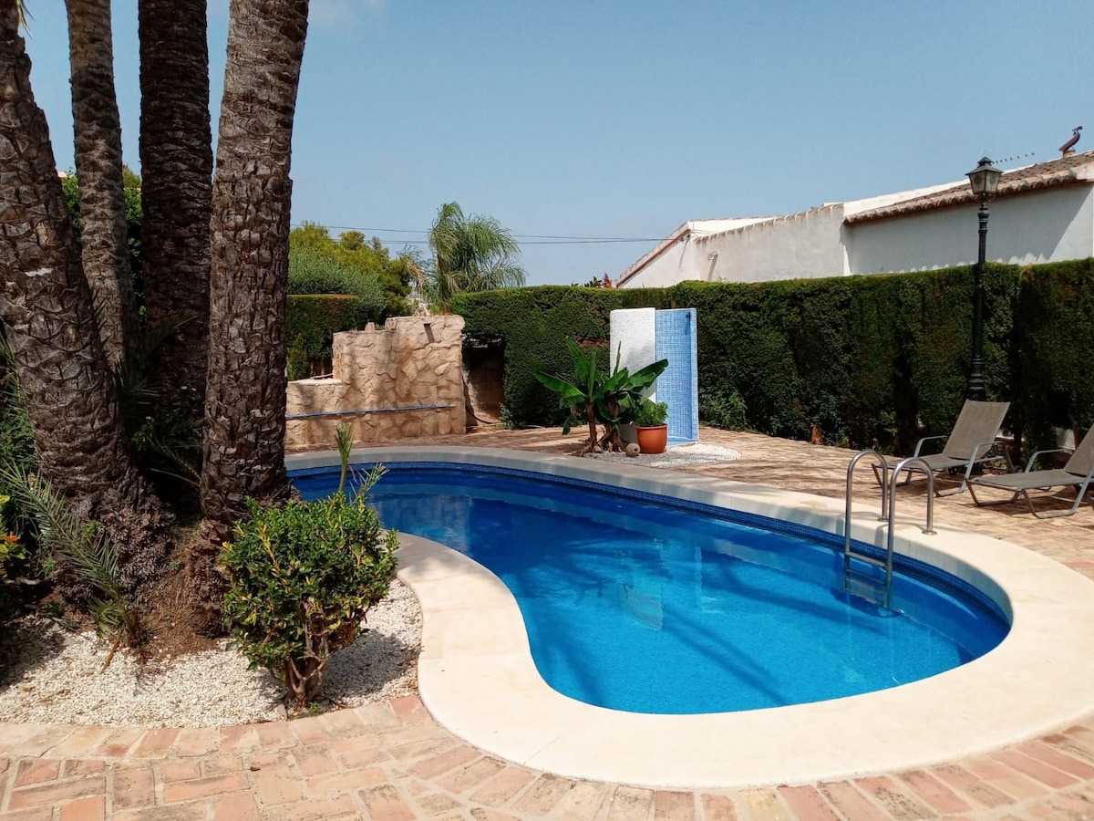 La casa esta cituada 5 min andando del centro historico de Javea. Es una zona muy tranquila con plaza para aparcar el coche al lado de casa. Apartamento en planta baja de villa rustica con acceso a jard'in y piscina y tiene una propia terracita. Dos habitaciones y dos banos en suite. Cocina equipada y salon con TV. Ocupacion 4 pax. Wifi gratuito.