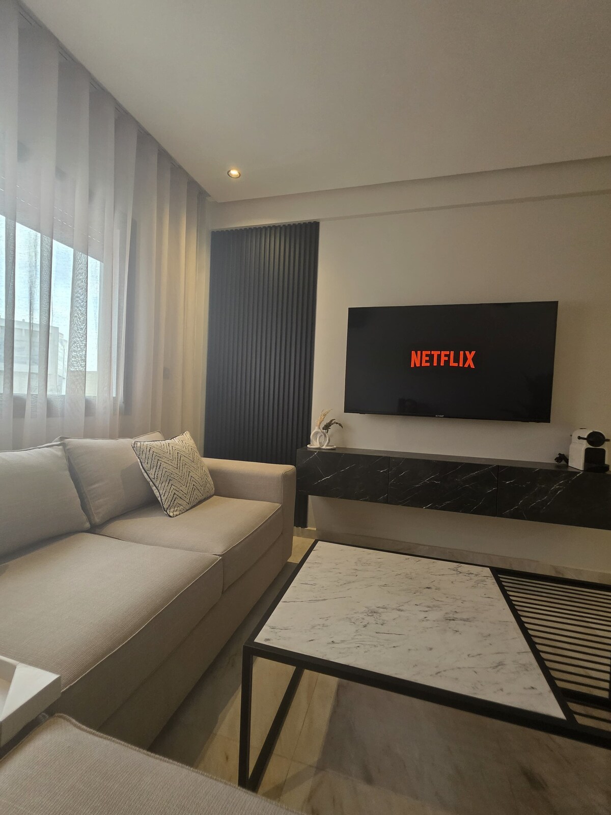 Perla 403 💎 , un havre de paix où l'élégance d'une résidence moderne s'allie au confort des hôtels 5* en plein cœur de Casablanca ! Relaxez-vous dans un salon spacieux au design moderne, équipé d'une Smart TV 55’ avec Netflix et IPTV pour des soirées de détente absolue. La chambre, véritable nid douillet, vous promet des nuits paisibles et réparatrices ☁️ Depuis votre balcon privé, admirez les splendides couchers de soleil sur la ville, rendant chaque moment de votre séjour inoubliable ! ✨