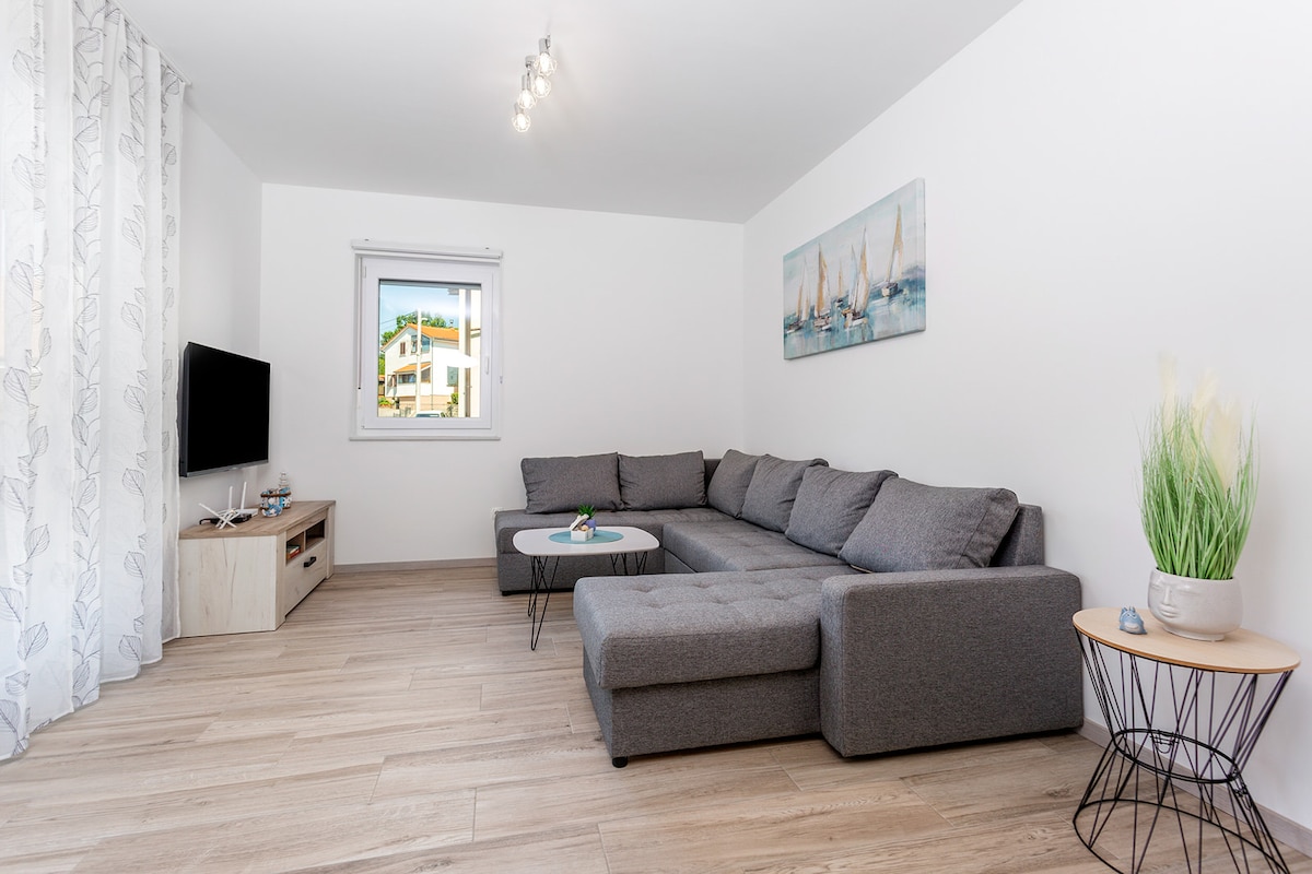 El apartamento está situado cerca del centro de la ciudad de Opatija, a solo unos minutos en coche o a ocho minutos a pie. Consta de una sala de estar, dormitorio, un comedor, dos baños, cocina, sauna, salón de espacio abierto, terraza, un jardín circundante y un estacionamiento. Gracias al hecho de estar en la planta baja con un jardín circundante, tienes la sensación de alquilar una casa y no un apartamento.