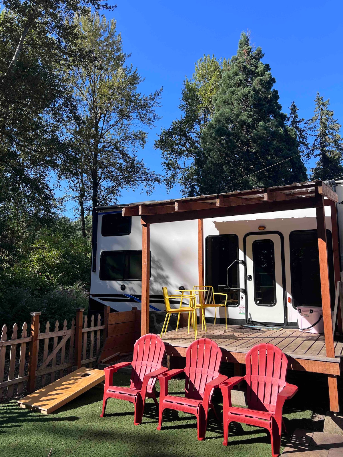 The river is calling you. Recharge your batteries while staying on the river in peace and quiet. 15 minutes to Salem or Independence, 8 minutes to I-5 and wineries! At our 42 ft. 2020 river retreat you can kayak, paddle board, swim, fish, or float to your hearts content. Or sit back on the deck with a glass of wine. The view will wow you! Kids and pets love our fenced turfed area with slide. The bunkhouse floor plan has 2 rooms upstairs and master downstairs. Makes for a great sleepover!