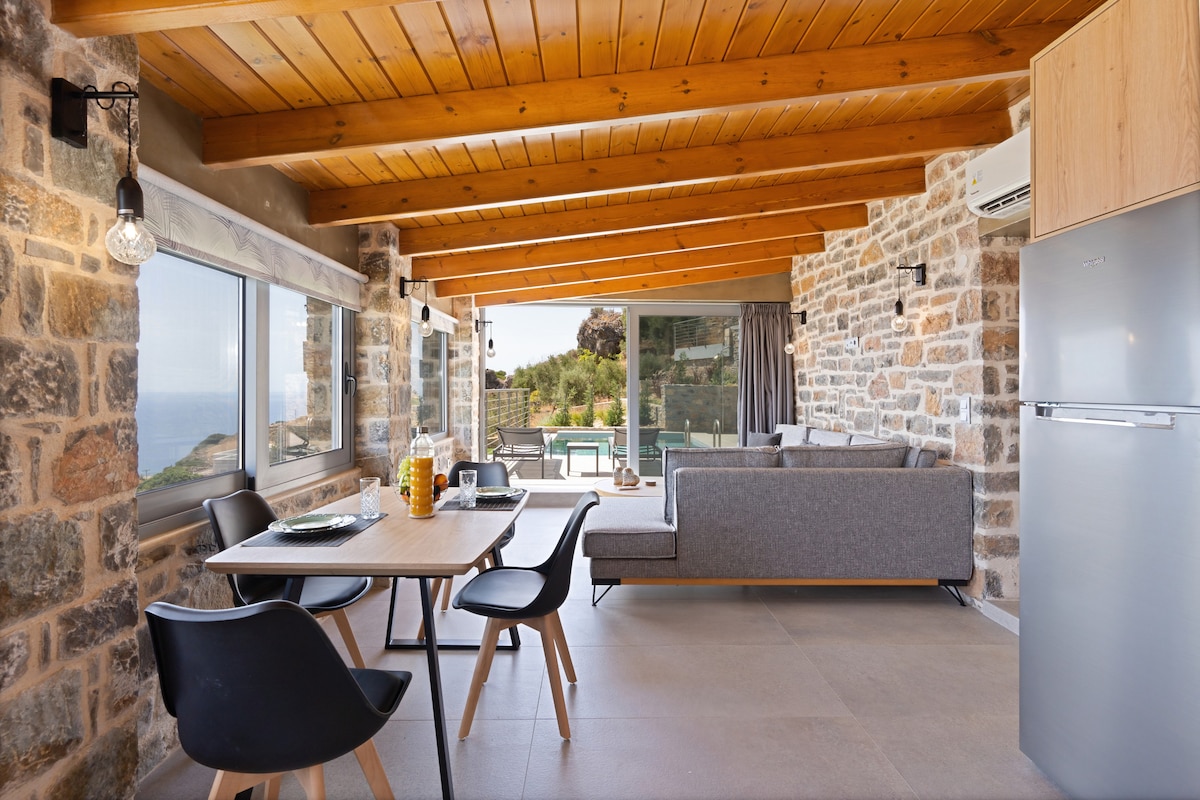 Las casas con piscina Galux ofrecen la combinación perfecta de lujo moderno y encanto cretense, enclavadas en las colinas de Agia Galini con vistas panorámicas al mar de Libia y al pintoresco pueblo de abajo. Estas dos villas privadas están cuidadosamente diseñadas para la relajación y el estilo. Cada villa cuenta con una amplia sala de estar de planta abierta en la planta baja, completa con TV inteligente, aire acondicionado y una cocina totalmente equipada para que puedas prepararte tus comidas sin esfuerzo. Un cómodo baño para huéspedes también se encuentra en la planta baja.