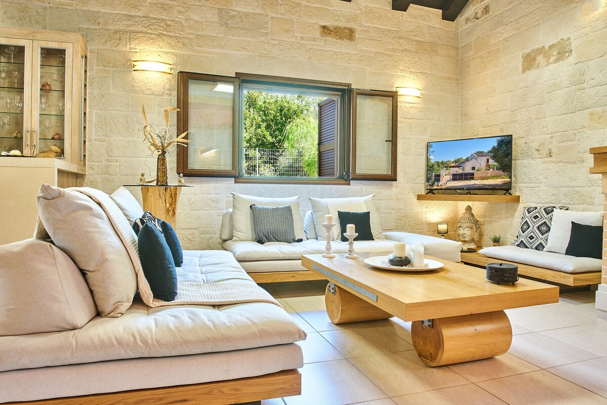 A fully renovated, stonebuilt compound built on top of three ancient greek grottos. It used to be a Venetian olive press factory. Now it's a contemporary holiday home with two pools (indoor and outdoor) and an organic vegetable and local fruit garden