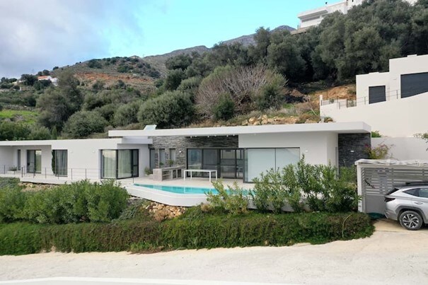 This architecturally designed villa offers stunning views from every room, showcasing a beautiful blend of minimalistic design with the natural surroundings of southern Crete. The incorporation of an olive tree growing through the terrace roof and the use of local stones and materials emphasize the connection to the environment. All bedrooms feature private bathrooms and provide panoramic views of the hills, mountains, and the sea.