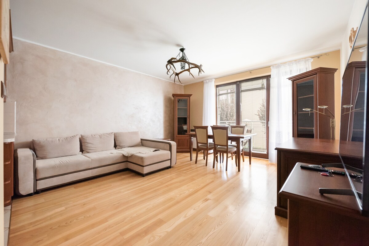 Relájate en este espacio tranquilo y elegante. El apartamento está preparado para estancias cortas y largas. El apartamento es luminoso, soleado y tranquilo, y tiene una zona de estar en el balcón. La cocina está equipada con todos los accesorios necesarios, es decir, hervidor de agua, placa eléctrica, nevera con congelador, lavavajillas, armarios con un juego de ollas, cubiertos, café, té y especias básicas para cocinar. Hay un salón con una zona de confort y un dormitorio separado con una cama grande.