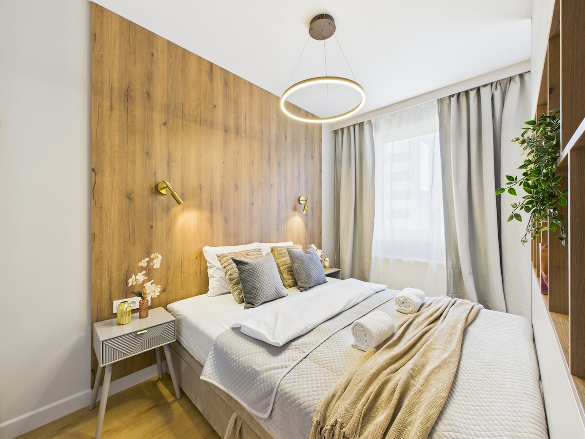 AmSuites: descubre una mezcla única de lujo, comodidad y diseño escandinavo en este elegante apartamento de la ciudad, perfecto para una escapada romántica, trabajo remoto o una relajante escapada a la ciudad. ✨ Aspectos destacados: - Jacuzzi climatizado 🧖♂️ durante todo el año en una terraza privada en la azotea de 55m ². - Televisor inteligente de 📺 55 pulgadas. - ❄️ Aire acondicionado, wifi de alta velocidad y cocina completa. - 🚗 Aparcamiento seguro gratuito en el garaje incluido. Sumérgete bajo las estrellas, relájate con serena comodidad y haz que tu estancia en Varsovia sea inolvidable.