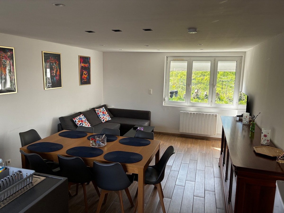 Casa adosada de unos 80 metros cuadrados cerca de las termas (a 10 minutos como máximo) Alojamiento entero ideal para una pareja con uno o dos hijos Bajo Sala de estar con sofá y TV Cocina equipada: nevera, vitrocerámica, microondas, campana extractora, horno. Lavavajillas, cafetera eléctrica, senseo Cuarto de baño con ducha italiana Aseo independiente Arriba 2 habitaciones equipadas con cama de 140x190 Cerca del centro de la ciudad y de los centros comerciales Bosque de Saint-Amand a 3 minutos