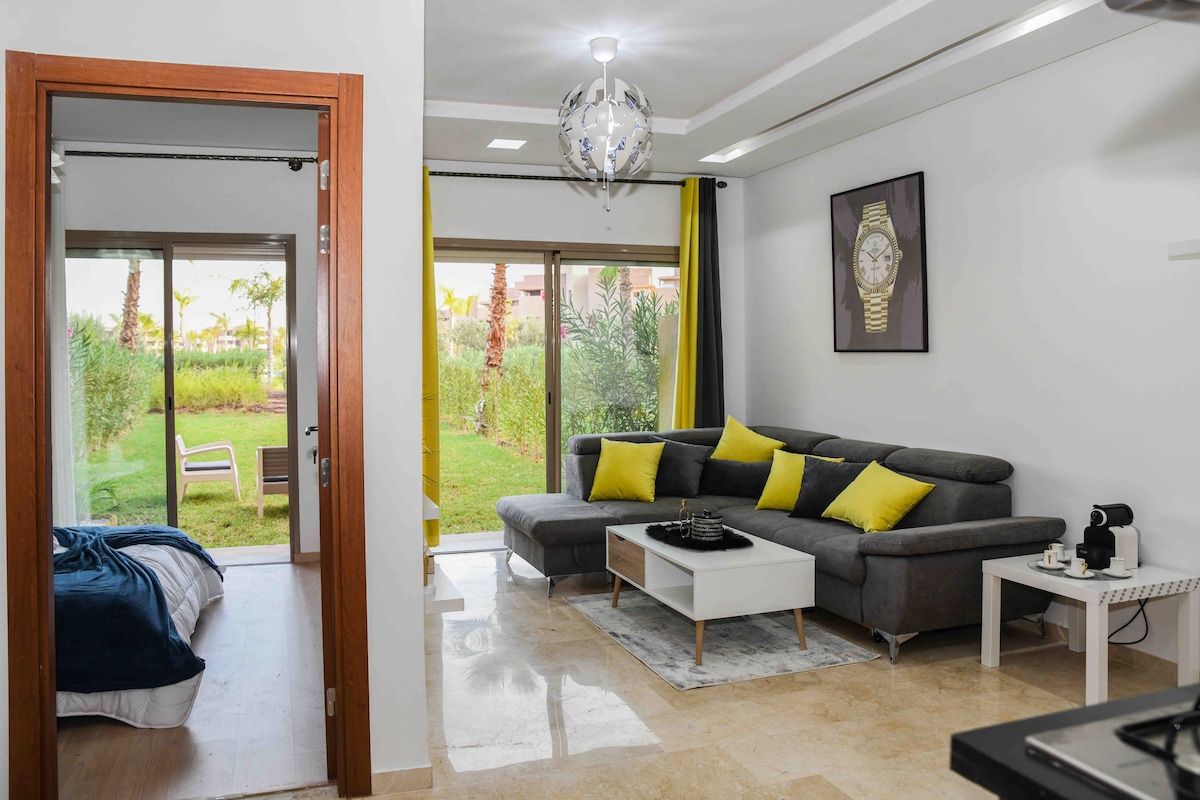 Apartamento lujoso y luminoso y maravilloso lugar para estar durante las vacaciones, con su jardín privado en el centro vacacional de golf Prestigia más exclusivo y céntrico en Marrakech. Ubicado a solo 5 minutos en coche del aeropuerto de Marrakech Menara y a 5 minutos en coche del centro de la ciudad de Gueliz y de los zocos de Médina. En los centros vacacionales Prestigia encontrarás paz, calma y seguridad segura, así como para todas las distracciones que absolutamente necesitarás, como para ir de compras y entretenimiento (golf, clubes, restaurantes, cine...)