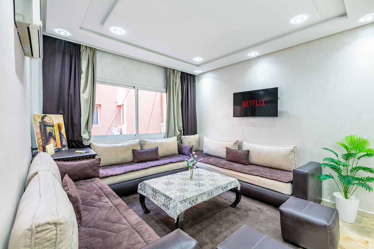 Acogedor y moderno apartamento, cerca de todos los servicios, seguro, velocidad de internet de 100 megas, aeropuerto de Marrakech a 20 minutos a pie, estación de tren, jardines al lado, medina.medio de transporte al lado Estaré a su disposición durante toda su estancia y para hacer su estancia inolvidable, , para las personas Marie o familia , individual,las parejas extranjeras no necesariamente le ofrecemos especialidades marroquíes he hecho traslados al aeropuerto por la mañana temprano organizado