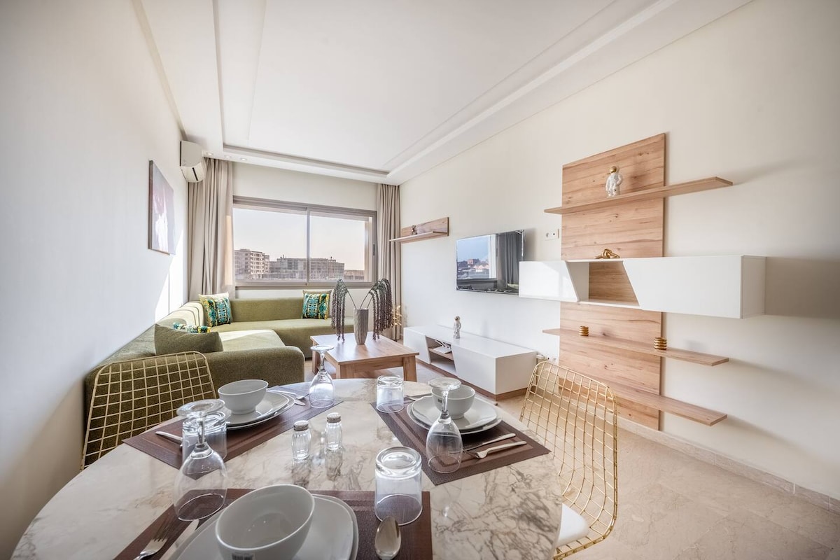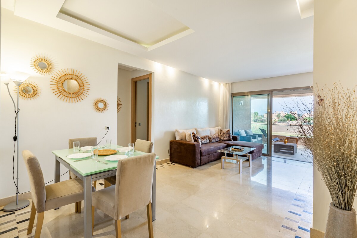 Despiértate con vistas abiertas al campo de golf en un apartamento luminoso y moderno de 2 dormitorios dentro de una residencia tranquila y segura. Terraza privada soleada, 2 piscinas y fácil acceso a las principales áreas de Marrakech, perfectas para familias, parejas o estancias de trabajo remoto. - Terraza privada con vista al campo de golf. - Acceso a 2 piscinas. - Interior moderno y luminoso - Wifi rápido + TV inteligente - Cocina totalmente equipada. - Aire acondicionado o calefacción - Check-in autónomo. - Aparcamiento gratuito - A 5 minutos del aeropuerto / 10 minutos de Gueliz y Medina.