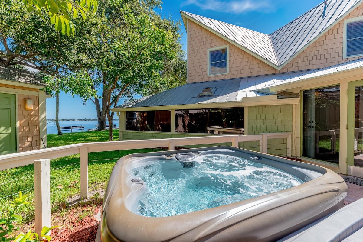 Private waterfront sanctuary w/ dock, tiki, hot tub, pool & yard. Comfy, spacious area to kick back & relax. A natural preserve area showcases beautiful birds & wildlife. We have 7 kayaks. Boaters can dock boat & cruise to the ocean or downtown Stuart without any fixed bridges. We also offer 2 bikes. Cabin-like feel but w/ hurricane impact windows & doors, new floors, shower, vanity, kitchen countertop, & tiki hut. Two large hammocks & firepit. All the amenities of home but feels like paradise.