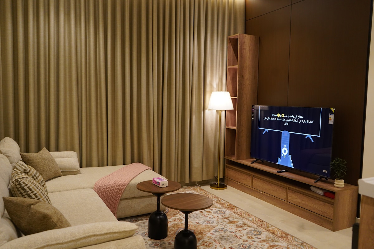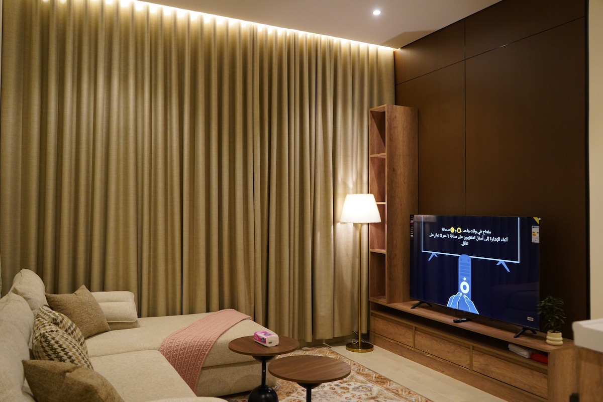Apartamento tranquilo que consta de un dormitorio de lujo, una sala de estar, una cocina completa para cocinar sus comidas favoritas y un baño totalmente equipado - Está a 5 minutos en coche de la Mezquita del Profeta y a 3 minutos en coche de la Mezquita de Quba, y muy cerca de la Pasarela de Quba y la Mezquita de Jumma. 🕌 - Todos los servicios, restaurantes y tiendas están disponibles las 24 horas - Sofá para relajarse - Pantalla inteligente de 65 pulgadas conectada a wifi para que disfrutes viendo la televisión con la familia - La pantalla inteligente tiene todas las aplicaciones de Netflix y YouTube Bienvenidos a nuestra nueva residencia💜 Estamos a su disposición durante toda la estancia