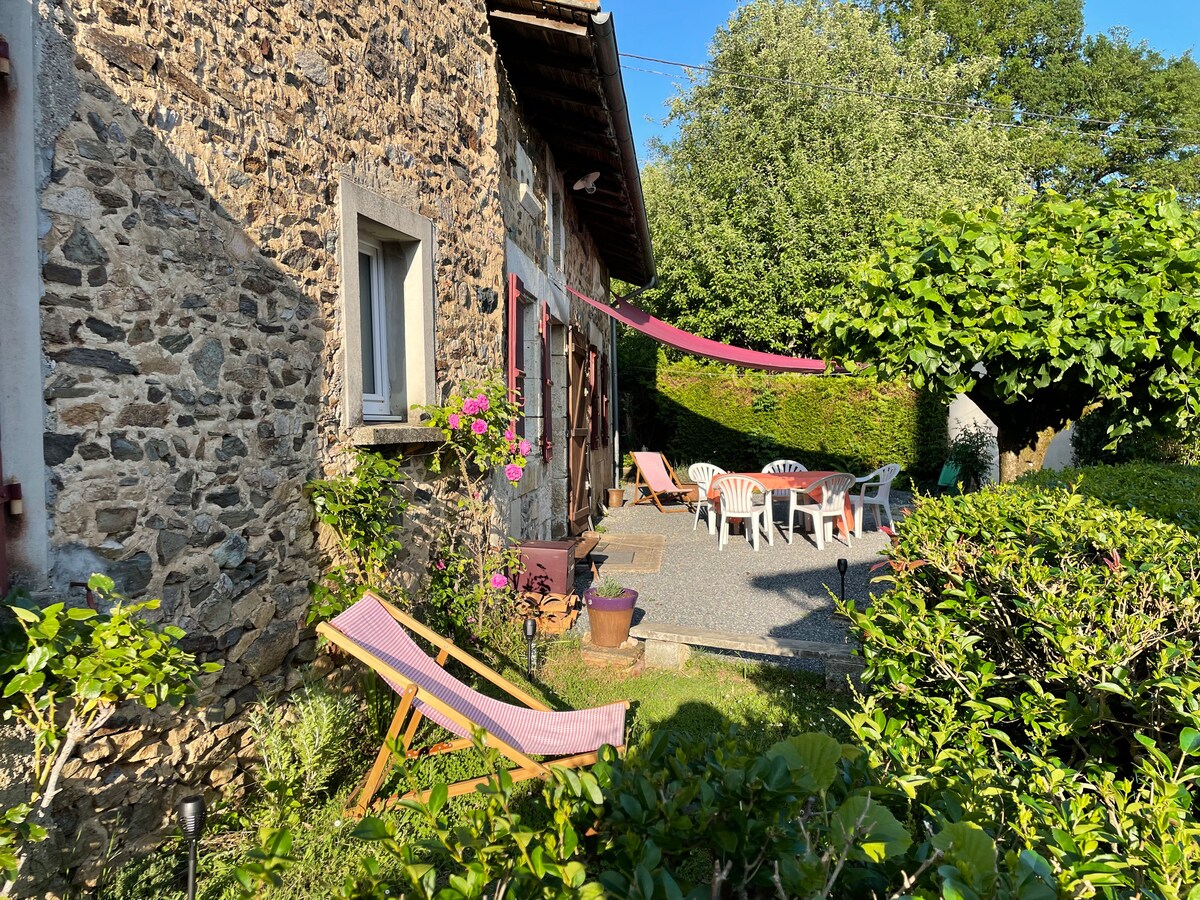 Dans un environnement protégé, vallonné et boisé de Charente Limousine, maison traditionnelle charentaise, entièrement restaurée, située dans un parc d'un hectare. Grande pièce familiale de 50m2. Grande terrasse en pierre ombragée par un pin parasol. Poêle à bois dans salon. Située en bordure de village avec accès direct aux chemins. Cadre idéal pour les sportifs et/ou les familles voulant profiter de la nature et des animaux : Chevaux, brebis, poules sont présents sur la propriété.