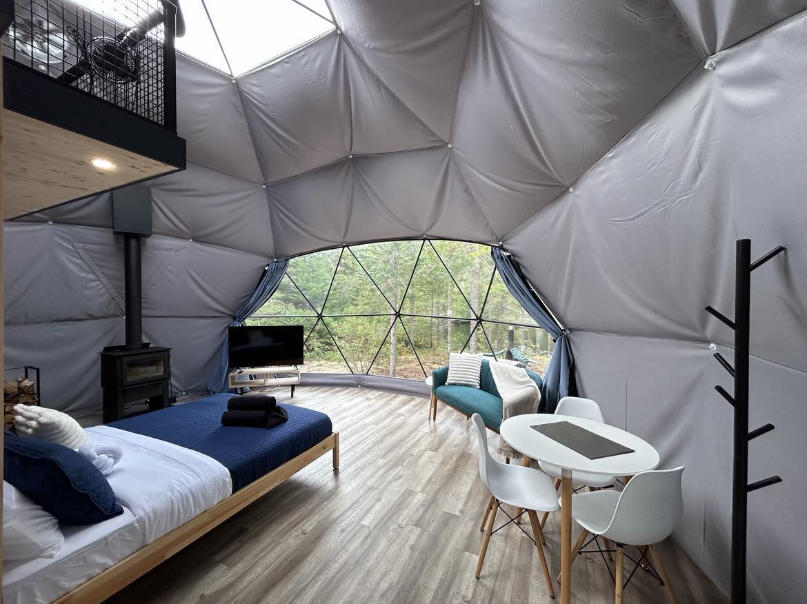 Descubre el refinamiento del glamping con nuestras elegantes y contemporáneas cúpulas de diseño, diseñadas para alojar hasta 4 personas, ubicadas directamente junto al borde del lago. Estas unidades están mejoradas con un spa de leña para la máxima relajación. Cada cúpula está equipada con una pequeña cocina, un mininevera, un baño completo, dos camas tamaño queen, un sofá, un comedor y una estufa de leña para envolverte con calidez. ¡Ven a experimentar la inmersiva vida al aire libre en el corazón de nuestro encantador complejo !