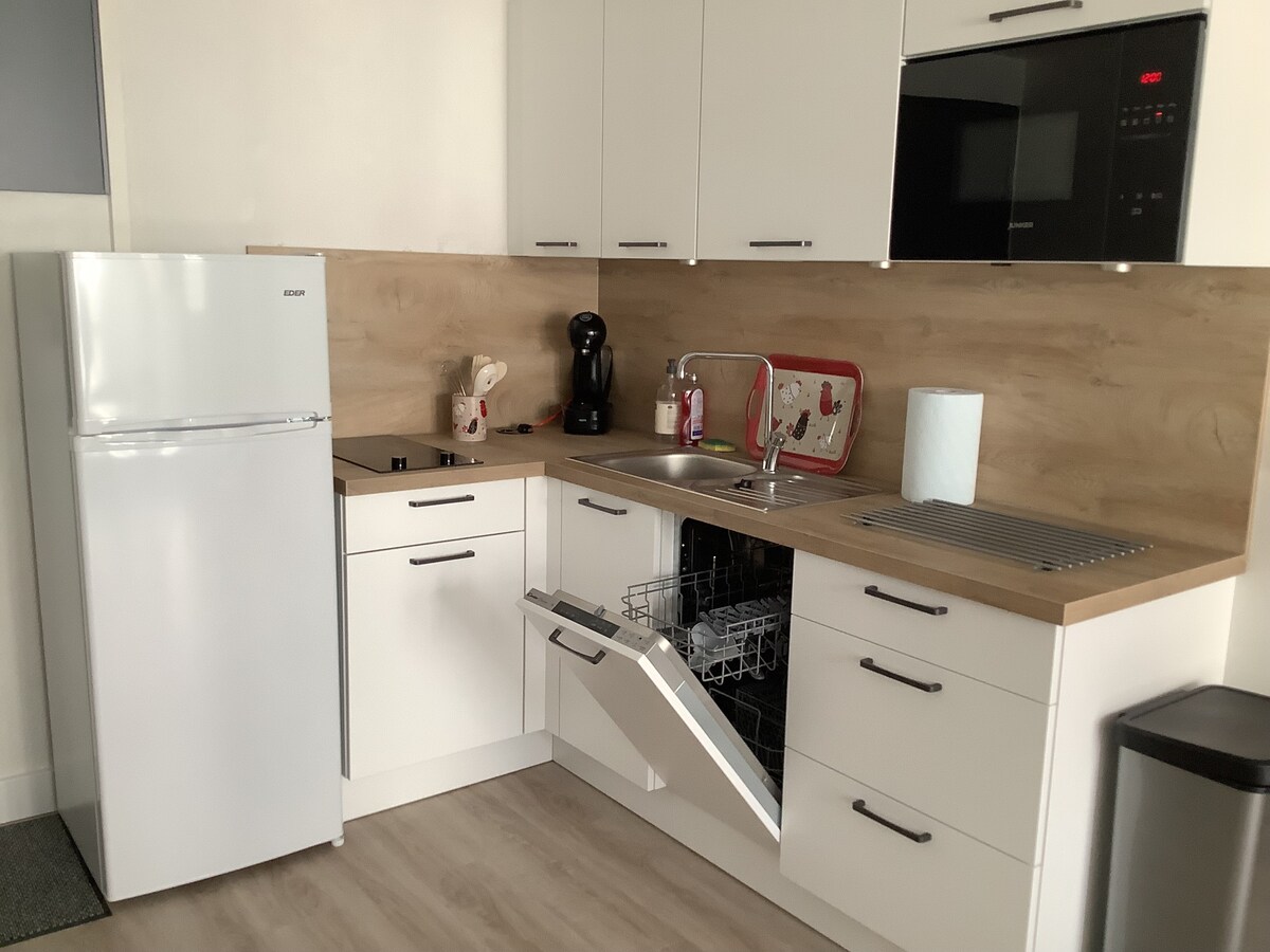 Creamos este apartamento de 40 m2 para alojar a nuestros amigos y familiares. Toda la comodidad en la planta baja, en una calle tranquila cerca de las tiendas. La sala de estar con cocina equipada y salón. El dormitorio para 2 personas (cama tamaño queen) con ducha y lavabo. así como una terraza de 10 m2. - Tarjeta de estacionamiento gratuita para todos los estacionamientos, excepto el número 1. -10 % de descuento en los masajes que ofrezco Quedamos a tu disposición para cualquier solicitud o necesidad adicional.