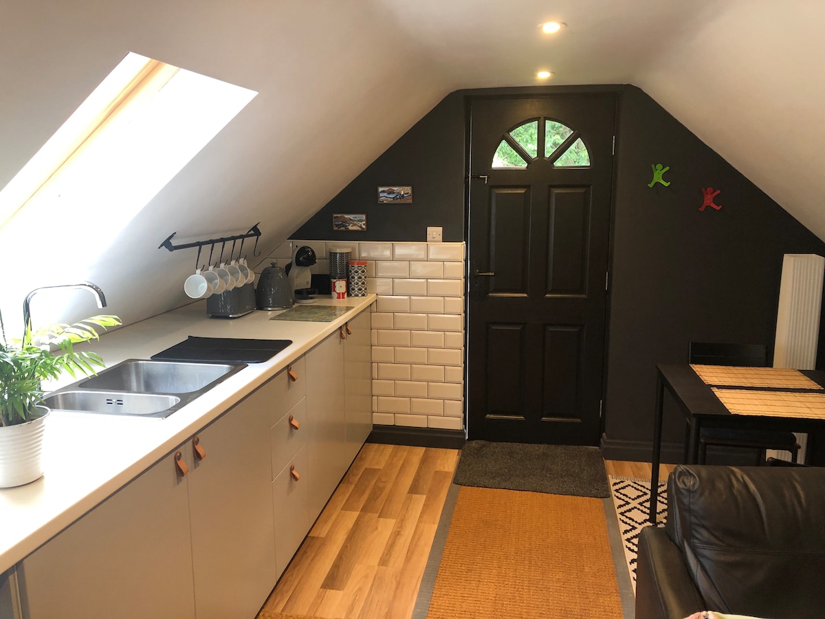 El anexo, separado de la casa principal, se encuentra dentro de un hermoso jardín ajardinado. El espacioso dormitorio tiene una cama doble y un televisor inteligente (tendrá acceso a Sky, Netflix, Apple+ y Paramount); el baño tiene una ducha a ras de suelo. La sala de estar separada tiene una mesa de comedor, un sofá y una nevera pequeña. Se proporcionan instalaciones para preparar té y café, cubiertos y vajilla (para llevar, etc.). El estacionamiento está en la parte delantera o lateral de la casa. Hay acceso a una buena conexión wifi . Se admiten mascotas.