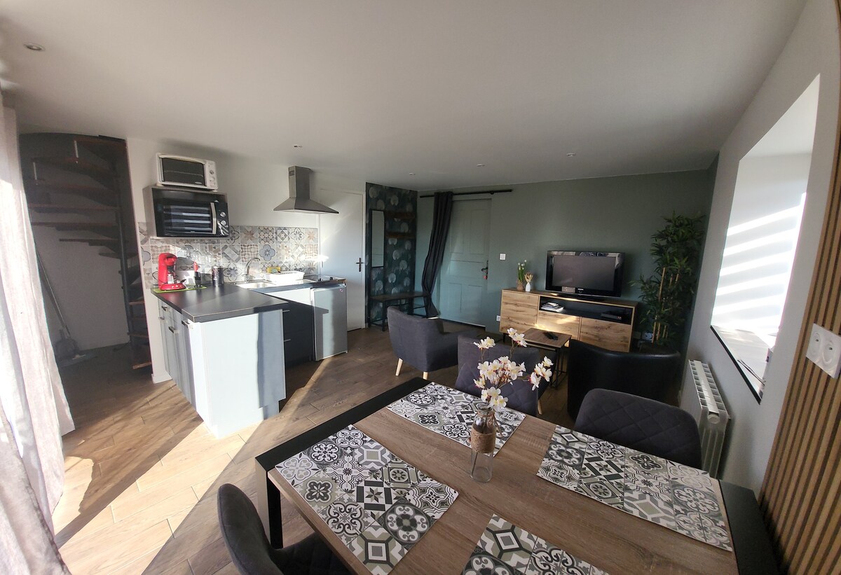 Au coeur de la campagne Mayennaise, venez découvrir cet appartement indépendant de deux pièces. Vous aurez pour vous un grand salon/salle à manger, une cuisine équipée, et à l'étage, une chambre à coucher avec un lit double et un lit simple, une salle d'eau (avec WC indépendants). Le logement est équipé du Wifi . Aucune maison dans le voisinage direct, le logement est donc très calme. Les propriétaires logent dans la partie droite de la maison.