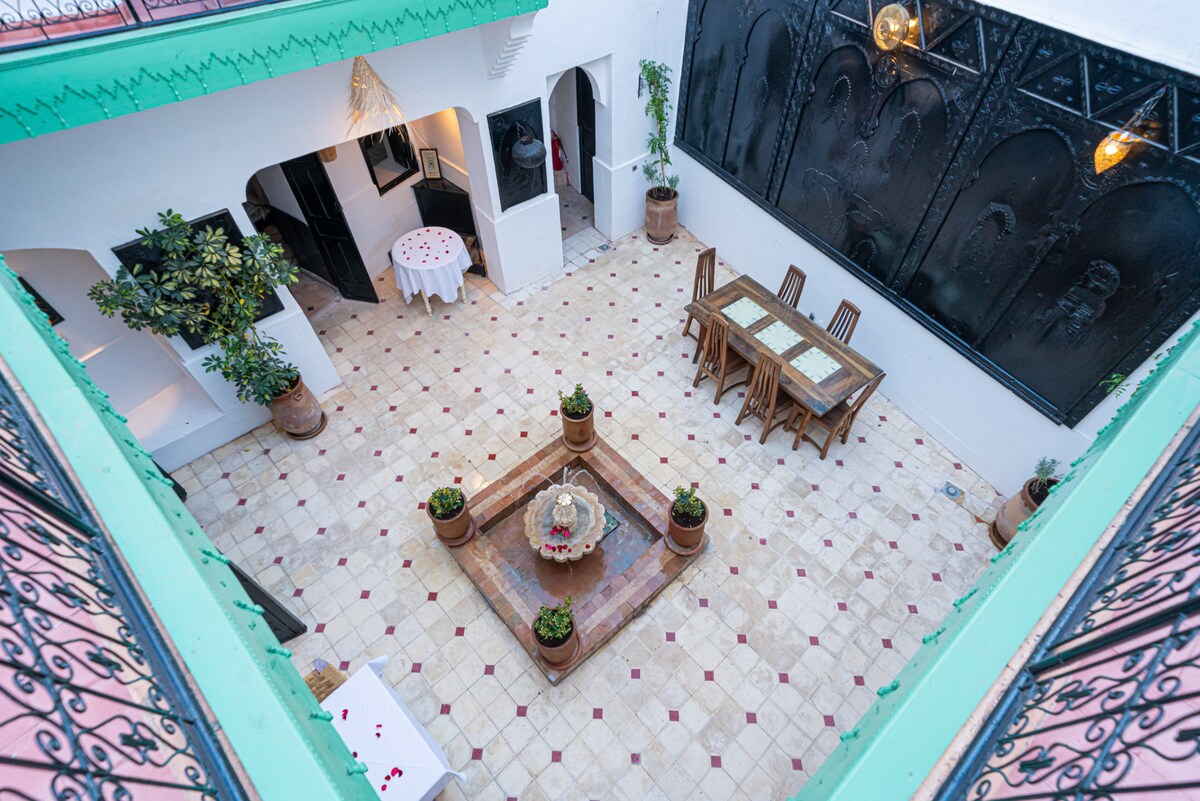 Bienvenido a nuestro tranquilo y bellamente restaurado riad marroquí, ubicado en el corazón de la antigua medina. Ya sea que estés aquí para explorar la cultura, la historia o simplemente relajarte, nuestro riad ofrece una mezcla única de arquitectura tradicional y cálida hospitalidad. Disfruta del desayuno en el patio o en la terraza de la azotea, donde puedes disfrutar de vistas panorámicas de la medina y escuchar los sonidos de la ciudad despertando. Por las noches, relájate bajo las estrellas con una taza de té de menta fresca.
