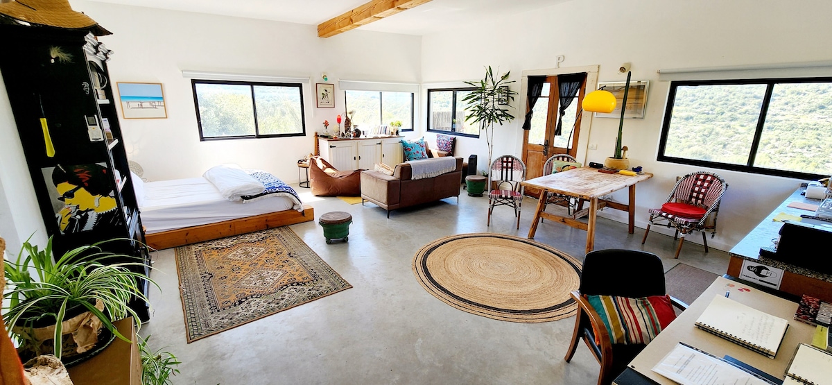 Un hermoso y espacioso loft con una vista increíble de un bosque natural. Un sentido de la vida dentro de la naturaleza en total privacidad. Ubicado en el valle de Jezreel en la Baja Galilea. El loft está bien equipado y cómodo para una larga estancia. Hay varias zonas de estar encantadoras en el jardín y en la terraza. Cerca de hermosas rutas de senderismo y bicicletas. Un gran lugar para artistas y escritores.