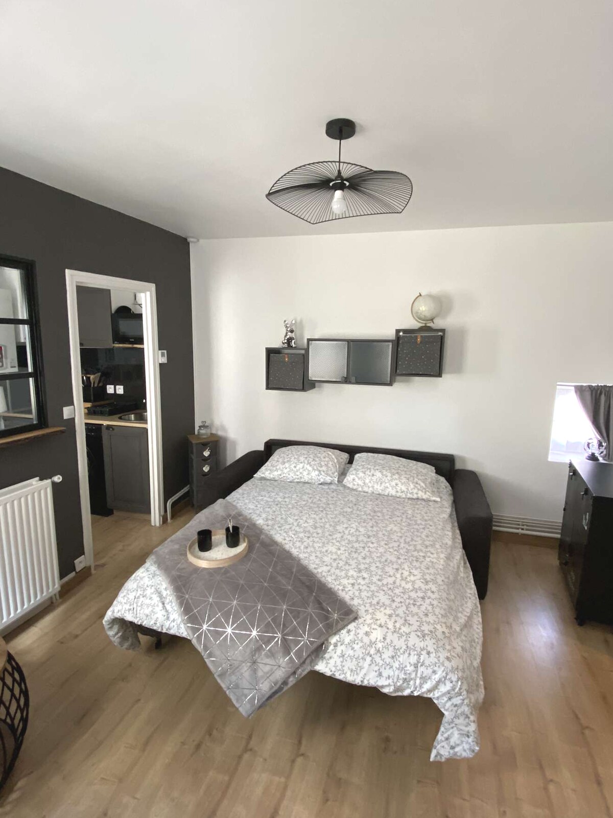 Estudio de 25 m² reformado, muy luminoso, situado al lado de la plaza de San Pedro (restaurantes, panadería, tiendas y mercado los sábados por la mañana) en una calle tranquila del centro histórico y al lado del castillo de Saumur. Está en el segundo piso de un edificio de lujo de toba/madera. Aparcamiento gratuito en las murallas a 70 metros. Muy buena red 4G, rúter con fibra. Consta de una sala de estar (sofá cama)/cocina equipada y baño separado con ducha e inodoro. Se proporcionan sábanas, toallas y productos de primera necesidad.