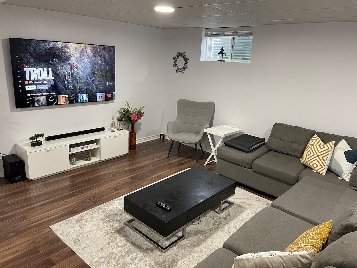 Experience modern comfort in our newly built Airbnb. This spacious three-bedroom basement features 3 comfortable beds and a sofa bed, with an en-suite bathroom in each bedroom. Enjoy a fully equipped kitchen, in-unit washer and dryer, free parking on the driveway, a stylish living room, high-speed Wi-Fi, and Smart TVs with free access to Netflix, YouTube Prime, and Amazon Prime TV. Our place has a private entrance and is located in a modern, quiet, and peaceful neighborhood.