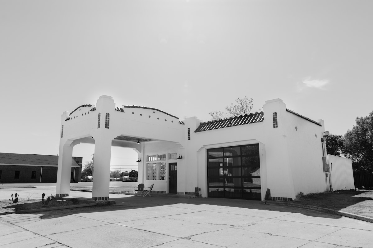 Esta casa privada de 1 dormitorio y 1 baño fue originalmente una histórica gasolinera Sinclair. Renovado en 2023, hemos conservado la mayor cantidad posible de elementos del edificio original mientras lo restauramos para crear una experiencia única y relajante. El área de la bahía se ha convertido en un espacio para vivir y dormir que incluye un televisor y una zona de estar, así como dos camas tamaño queen y un sofá cama. El antiguo espacio de oficinas ahora cuenta con una cocina completa. Un patio trasero, chimenea, lavadora y secadora se encuentran en el sitio.