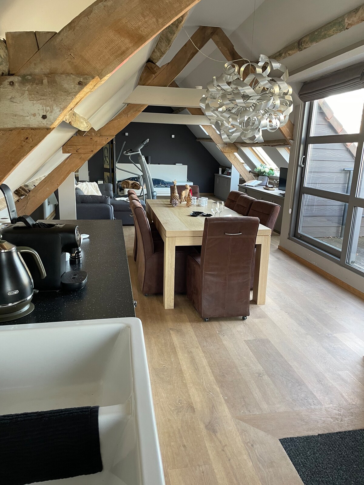 Loft único en el primer piso con preciosas vistas a los campos y los caballos. Relájate en la amplia cama doble o duerme cómodamente en el sofá cama plegable. La cocina está equipada con lavavajillas y freidora de aire. El baño tiene una lavadora con secadora para mayor comodidad. Disfruta de la paz y la relajación en la acogedora terraza para cenar al aire libre. Estacionamiento grande justo en la entrada y 2 bicicletas nuevas para descubrir la zona. Perfecto para aquellos que quieren combinar comodidad, tranquilidad y naturaleza.