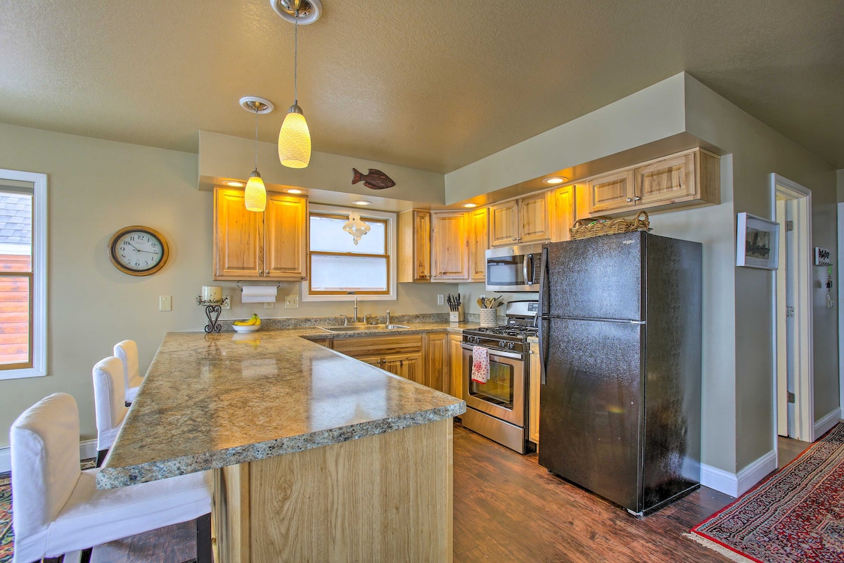 Welcome to The Loghaus! Cozy, rustic log cabin with beach access and stunning lake views. Take in the sunset each night from the private porch overlooking the lake! Freshly renovated kitchen with farmhouse sink, new appliances and cabinets. Brand new Nectar beds throughout the cabin, and a beautiful sunroom for cards, games & watching the sunset. One block from public boat launch, access to county beach and park areas.Centrally located to town, restaurants, bars, playground, and nature area.