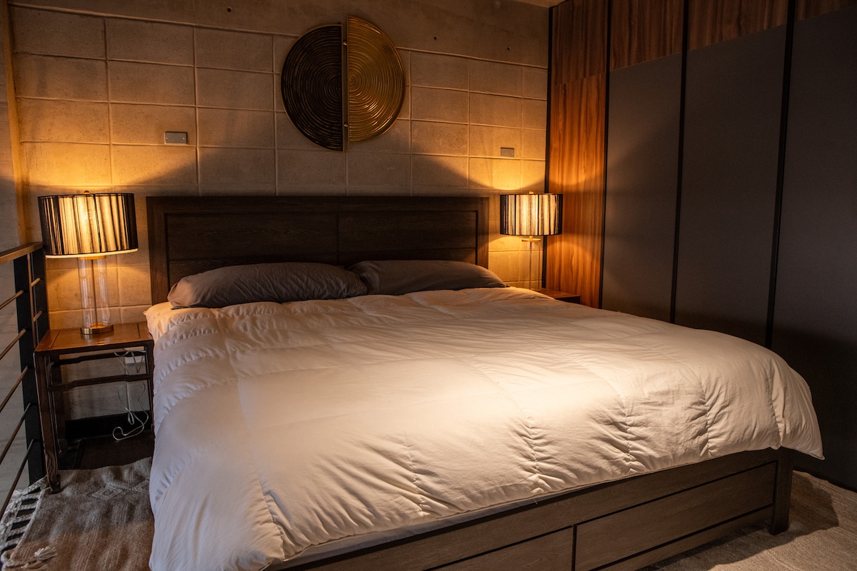 Elegante loft con paredes de concreto, vigas de acero y acabados de madera y un ambiente botánico pintando un estilo fresco e industrial. En la recámara disfruta de una vista enorme de la calle más histórica de Tijuana. Sube a la azotea para disfrutar de un concierto y vistas de las calles junto a una fogata. Seguridad 24/7 y acceso solo con tarjeta. Experimenta la ubicación más céntrica de Tijuana donde clínicas, supermercados, bares, restaurantes y cafés a menos de 5 minutos a pie.