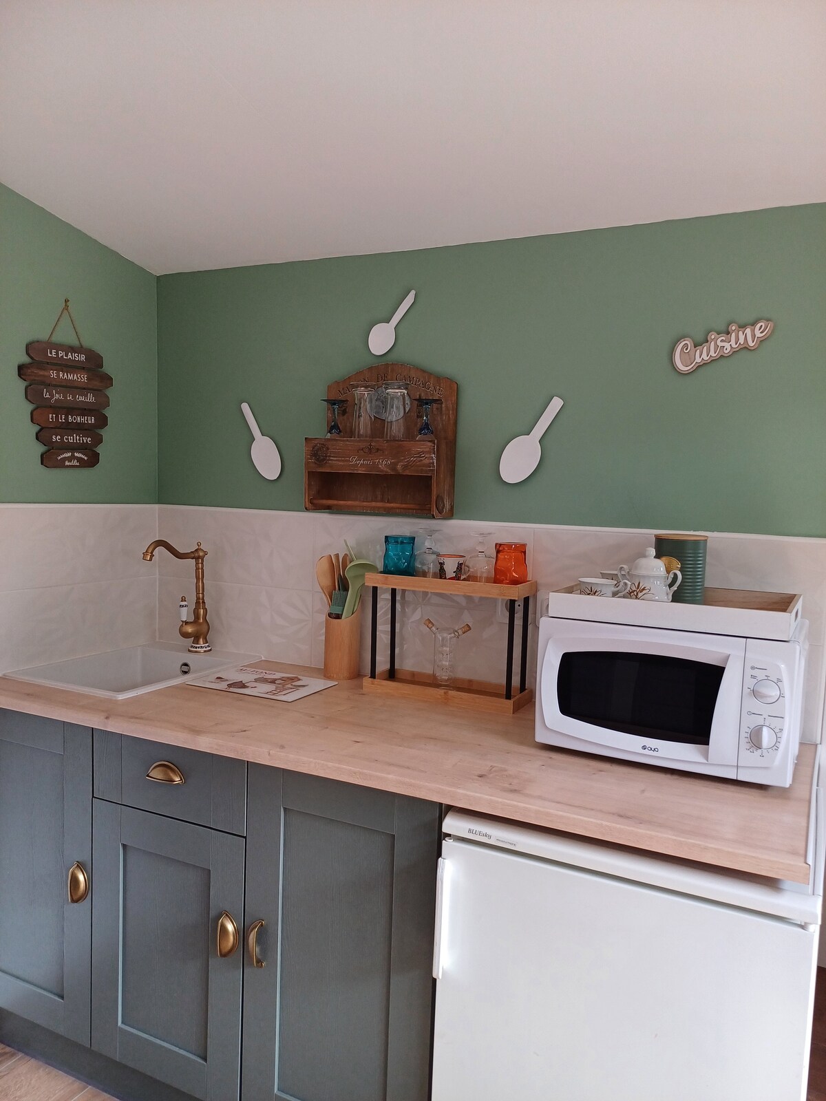 La Lanterne es una casa de campo tipo loft luminosa y llena de luz (50 m2) ubicada en Normandía, en un hermoso terreno de una gran casa a orillas del Sena en Tournedos-sur-Seine (un pueblo tranquilo a cuatro kilómetros de Le Vaudreuil/Val-de-Reuil). La casa ha sido recientemente amueblada y está totalmente equipada. Dos habitaciones grandes con cocina de planta abierta, dormitorio con cama matrimonial tamaño king, sofá, escritorio. Baño privado con ducha a ras del suelo. Decoración de lujo. Ambiente pacífico y mágico cercano a la naturaleza.