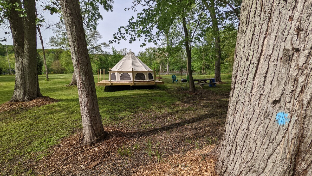 Nuestra tienda de campaña Cabana Bell de 13' de diámetro en nuestra orilla privada del río está cómodamente amueblada con 3 colchones de aire, sábanas y alfombras. Afuera tienes una mesa de picnic, un anillo de fuego abastecido con madera y una pequeña parrilla, carbón vegetal provisto para la primera comida. (trae carbón vegetal adicional). Jarra de agua de 5 galones con bomba manual. Este es un gran lugar para retirarse después de un día de diversión y emoción recorriendo nuestro río natural o las bodegas y atracciones locales.
