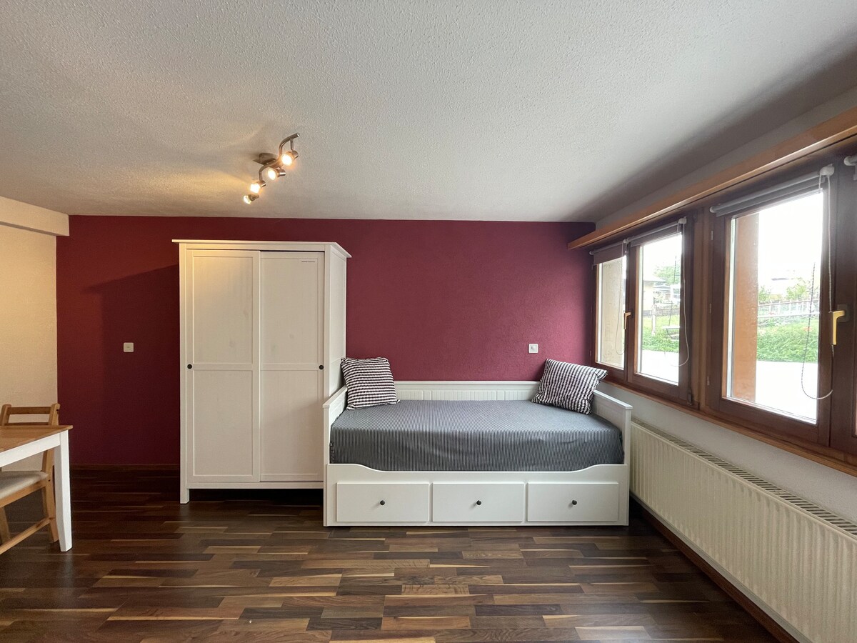 Bienvenido a Sierre en la llanura del Valais, rodeada de los Alpes suizos. El estudio con su propia entrada está ubicado en la planta baja de nuestra casa familiar en un vecindario muy tranquilo a unos 8 minutos a pie desde la estación de tren/centro de la ciudad. La céntrica ciudad Sunshine "Sierre es el punto de partida para los amantes de los deportes de verano e invierno. Estaremos encantados de responder a tus preguntas y deseas que disfrutes de una estadía inolvidable y agradable. Nos alegra mucho poder poder recibirte.