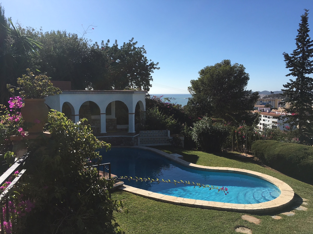 Chalet independiente en tranquila urbanización en lo alto del barrio del Palo y sus playas. Bajando la cuesta a 10 minutos de la playa y a 15 del Barrio del Palo y la parada del Bus al centro de Malaga. Las vistas desde la casa son increíbles, da la sensación de estar en un barco. Tiene 2 terrazas que dan al mar y una hermosa piscina con una cocina interior con barbacoa.
